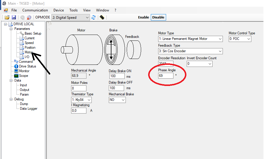 - The motor is moving a little bit and the stop with and increasing Q current ⇒ NOT OK ⇒ the phase angle is not correct calculated or the sequence of the motor phases U,V,W are not OK ⇒ Please check the power cable connections.