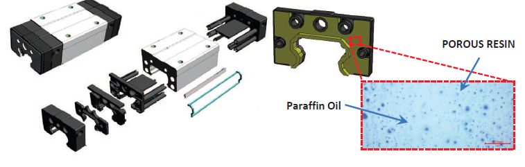 The lubrication is guarantee using porous resin containing lunricant. This lubricant improves drammatically the grease inteval.