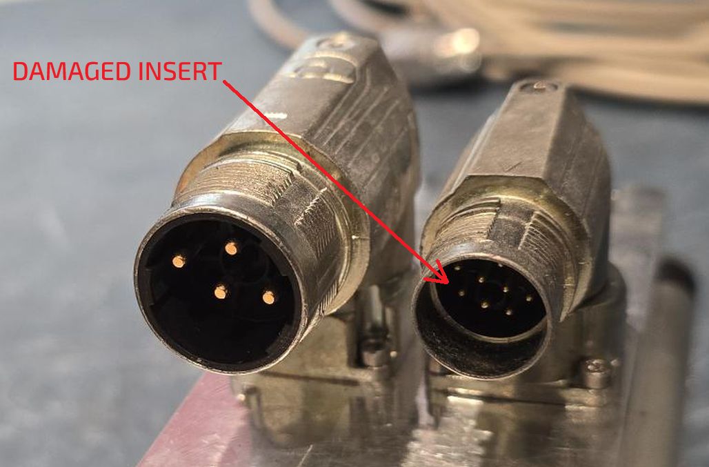 DAMAGED INSERT IS NOT ALIGNED WITH THE CONNECTOR FRONT SIDE NOT DAMAGED INSERT IS ALIGNED: ALL THE PINS ARE ALIGNED WITH THE FRONT SIDE