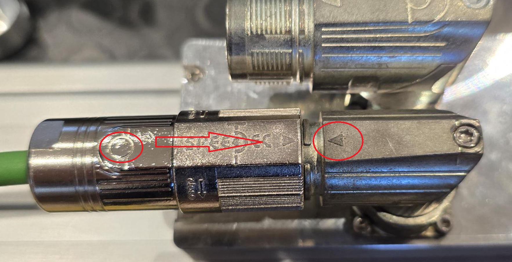 The standard connection system based on speedtec connector on the cable must be used with the right aligment before push inside the connector on the motor side. Please use the marker on the two connectors to avoid permanent damaged to inside parts of the connector on the motor side. (see photo below)