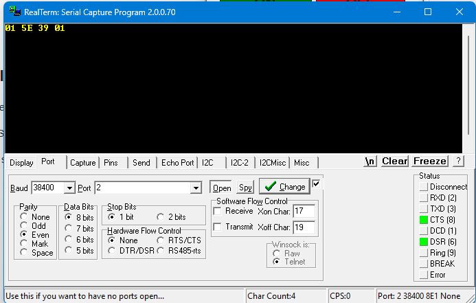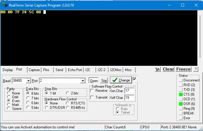 Please select in display ⇒ Hex(Space) as Display time, in Port select the right COM (in this example COM2) with 38400 baud, Parity Even, Databits 8, Stop bits = 1.