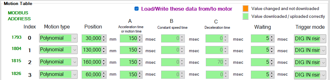 Here below one example considering a pick and place speed of 0.6 sec total pick and place time corresponds to 100 pick and place per minutes. The Master sync signal is generated by the master (motor 1) with a small delay (debouncing) of 3 msec after the detection of the rising edge of the Trigger Signal (DIgital Input 1 - Pin 9). This signal is generated for 4 times and it is the motion trigger of the slave (motor 2). The motion task of the motor 2 (slave) is performed at every rising edge of the Master sync received. In position signal is the confirmation of the motion due to the motor 2 (slave). When the In position level is low the motor has reached the position window. In position window tolerance is defined using the parameter 183 (dec). This parameter is present in the Motot parameter window of the NiLAB Starter software.