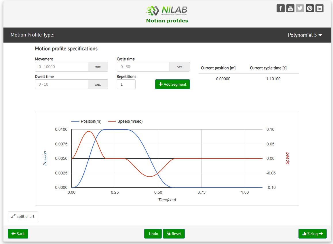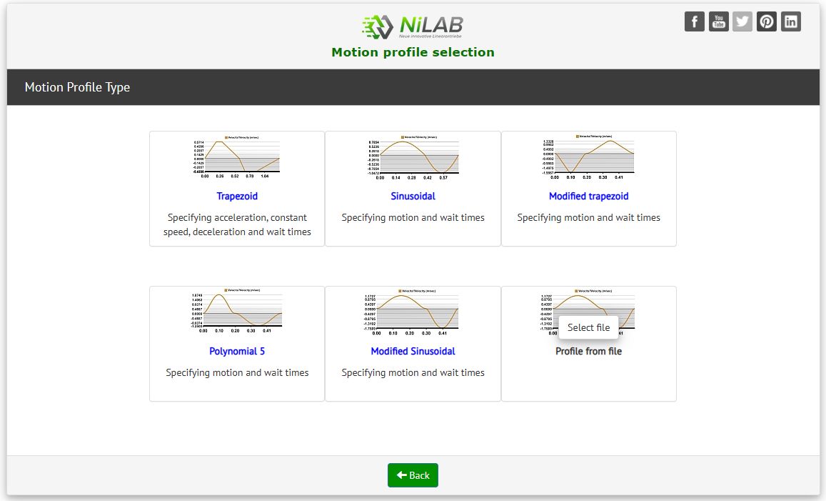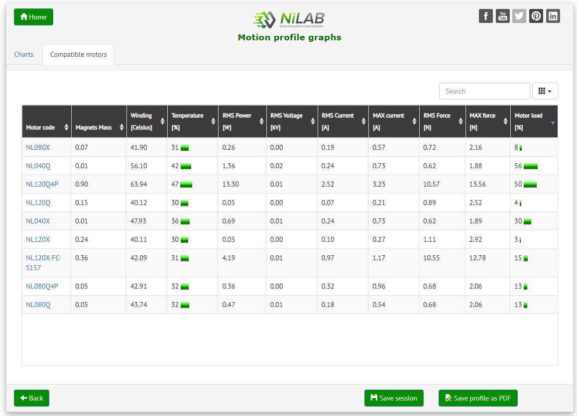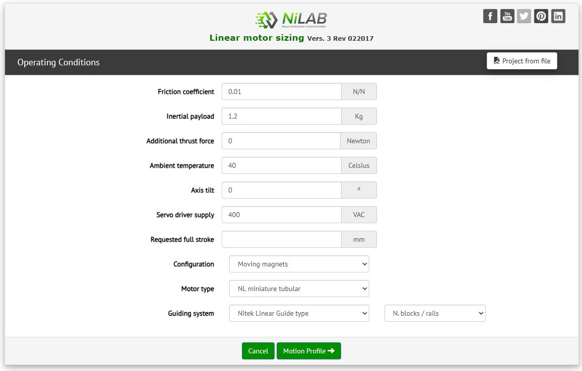 For example, an external payload of 1.2 kgs and a motor type wanted of NL tubular linear motors. Then press Motion Profile button.